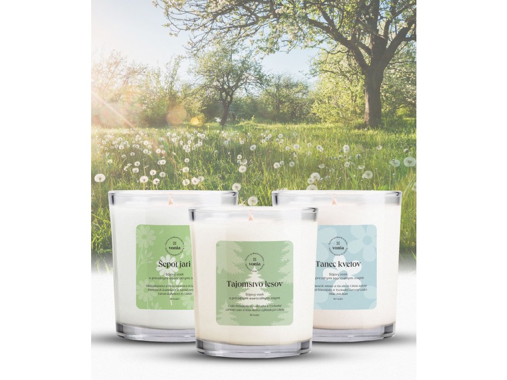 1. Sójová sviečka Šepot jari (180 g) - Táto sviečka prináša vôňu jarných kvetov s jemným nádychom mäty a citróna. Vďaka tónom mäty piepornej, litsea cubeba a santalového dreva vytvára harmonickú a osviežujúcu atmosféru, ktorá prebúdza zmysly k životu.
