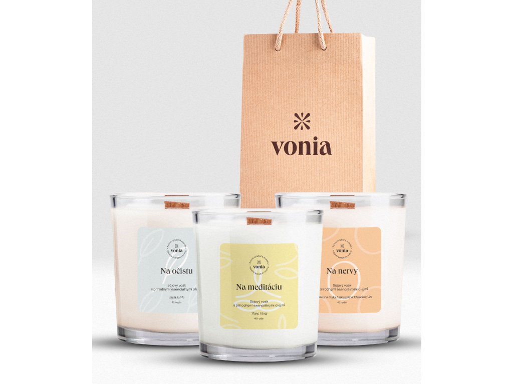 Darčekový set troch 100 % prírodných sójových sviečok, ktoré vám prinesú harmóniu, pokoj a rovnováhu. Zabalené v elegantnej darčekovej taške.