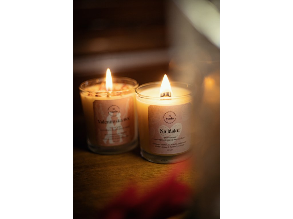 1. Sójová sviečka Na lásku (180 g) – 100 % prírodná sójová sviečka s dreveným knôtom a harmonickou vôňou sladkého pomaranča, lavandínu, geránia, cédra a rímskeho rumančeka, ktorá navodí upokojujúcu, hrejivú a jemne povzbudzujúcu atmosféru.